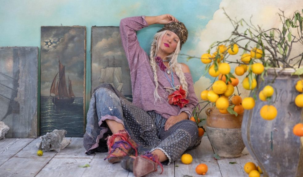 Magnolia Pearl does not sell polished perfection. Its official site presents a world of handmade craft, visible mending, and small-batch desire. The garments often appear softened by time, marked by patchwork, lace, distressing, and stitching that turns wear into part of the design.